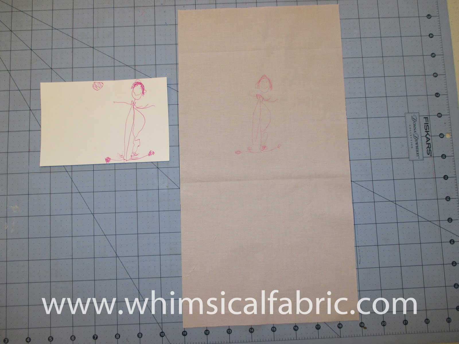 • Transfer the design (here I used a picture drawn by my five year old). I used a Frixion pen, but any water soluble pen/pencil will do. To transfer, I simply held the paper and the fabric up to our sliding glass window and traced the design.